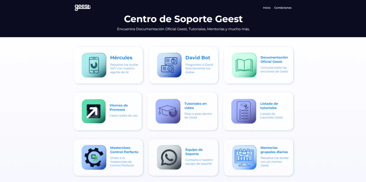 El botón Ayuda te lleva al Centro de Soporte Geest, un espacio diseñado para resolver dudas y guiarte en el uso de la plataforma.