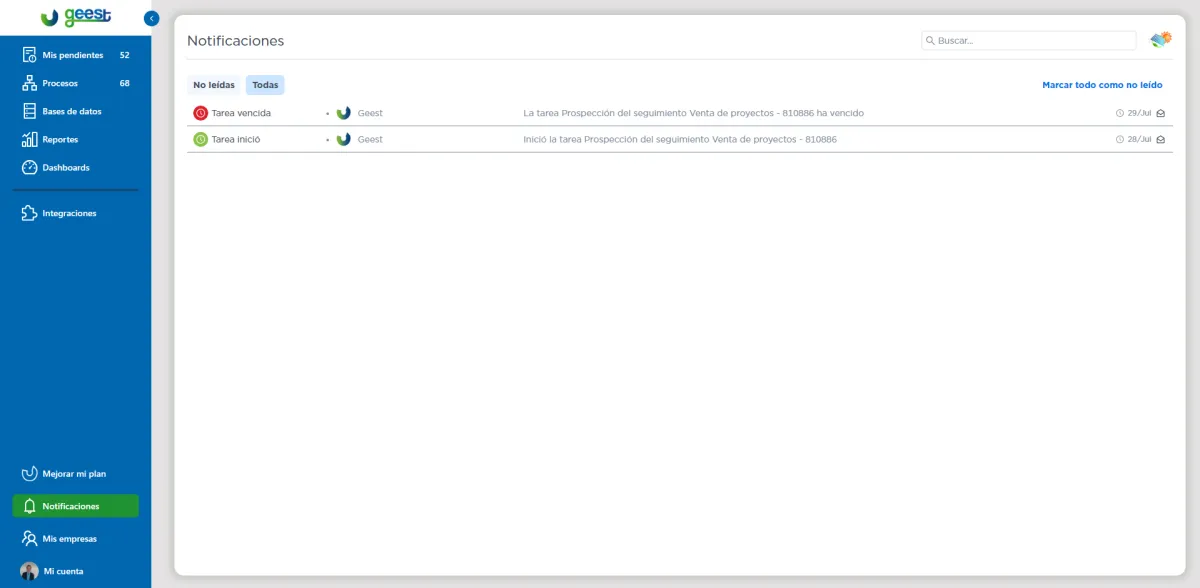 La sección de Notificaciones en Geest está diseñada para mantener a los usuarios informados sobre el estado de las tareas y eventos dentro de los procesos activos. En esta sección, puedes encontrar: