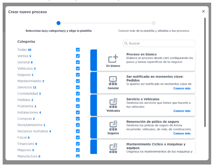 Al momento de dar clic en ”Proceso”, nos aparecerá un menú en el que tenemos que seleccionar la plantilla para nuestro proceso.