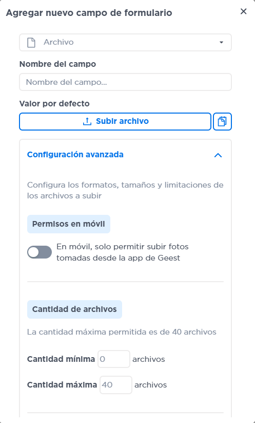 Geest te da la opción de controlar exactamente qué formatos de archivo se pueden subir, agrupados por tipo. Puedes activar o desactivar los tipos según lo que necesites recolectar.