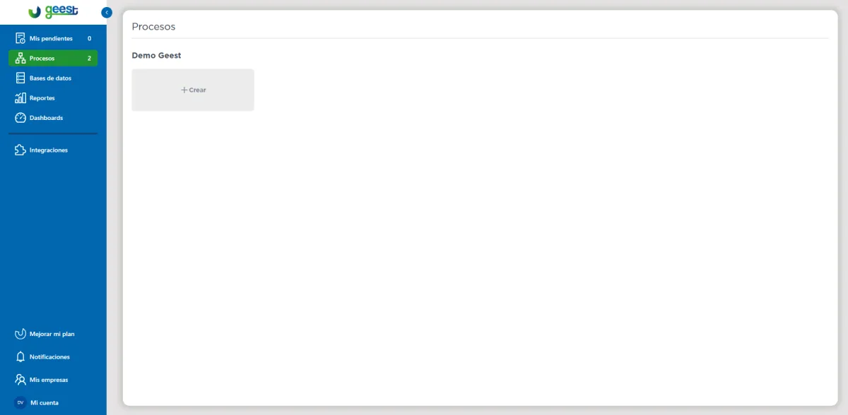 La sección "Procesos" en Geest es el centro de operaciones donde se administran, visualizan y lanzan los flujos de trabajo definidos para una empresa. Es aquí donde se materializa la estructura operativa, ya que cada proceso representa una secuencia organizada de tareas que responden a una necesidad recurrente del negocio.